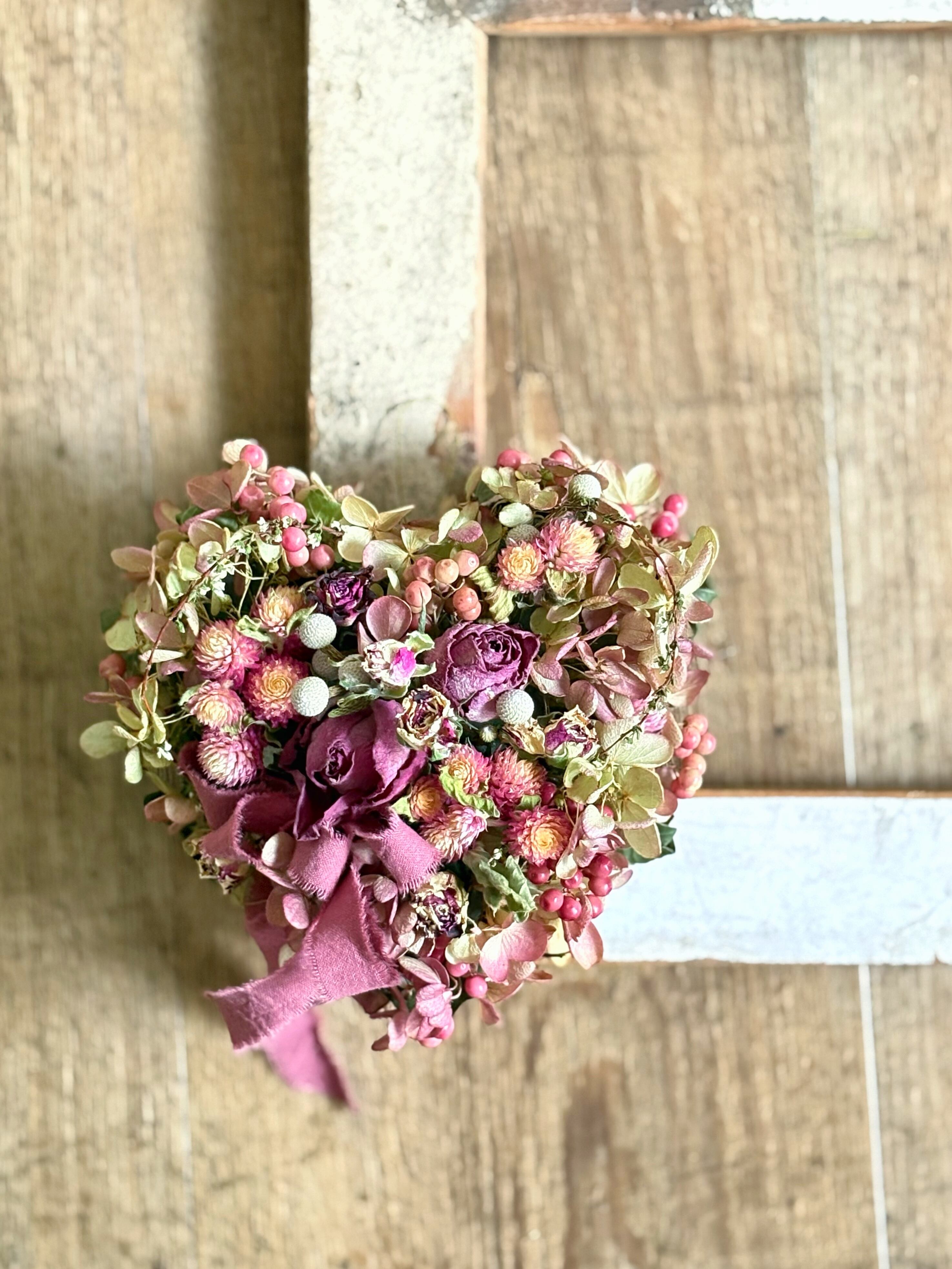 愛らしいピンク色のお花たちを使って、ハートの形に詰め込んだキュートな壁掛けアレンジです。温かなピンクのトーンが、見る人の心を癒し、特別な空間を演出してくれます。ご自宅用にも、大切な方への思いを形にした贈り物としても、心温まるギフトとなることでしょう。