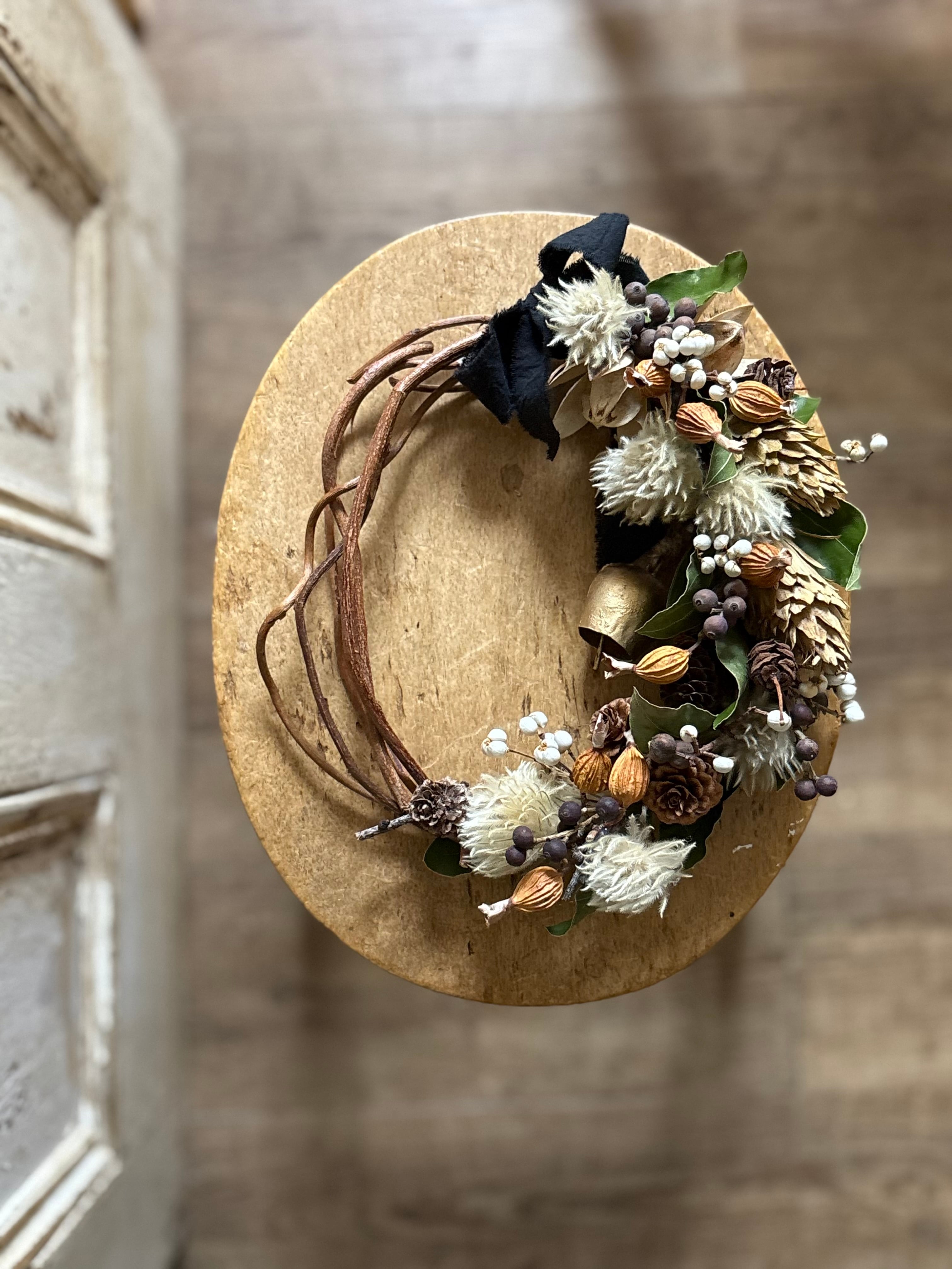豊かな秋の恵みを感じる、木の実とアイアンベルを組み合わせたハーフリースです。個性的なリースベースを生かし、蔓の表情を見せて仕上げました。リビングや玄関に飾ることで、温かみのある秋の雰囲気を演出し、あなたの空間を一層魅力的に彩ります。