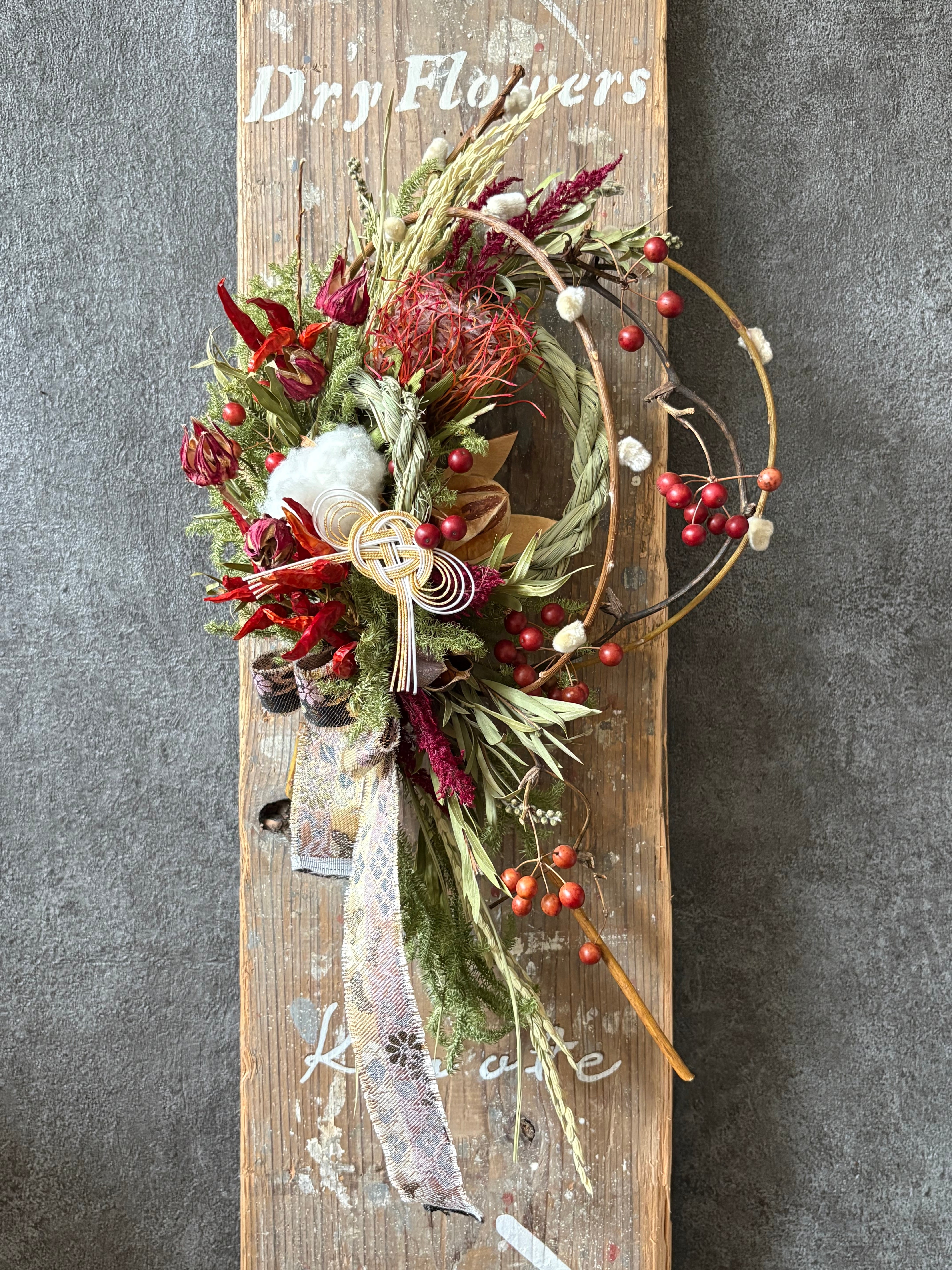 しめ縄、ネコヤナギ、ピンクッション、サンキライ、綿の実、ヒカゲカズラ、唐辛子、ローゼル、稲穂、ウモウケイトウ、金宝樹など
