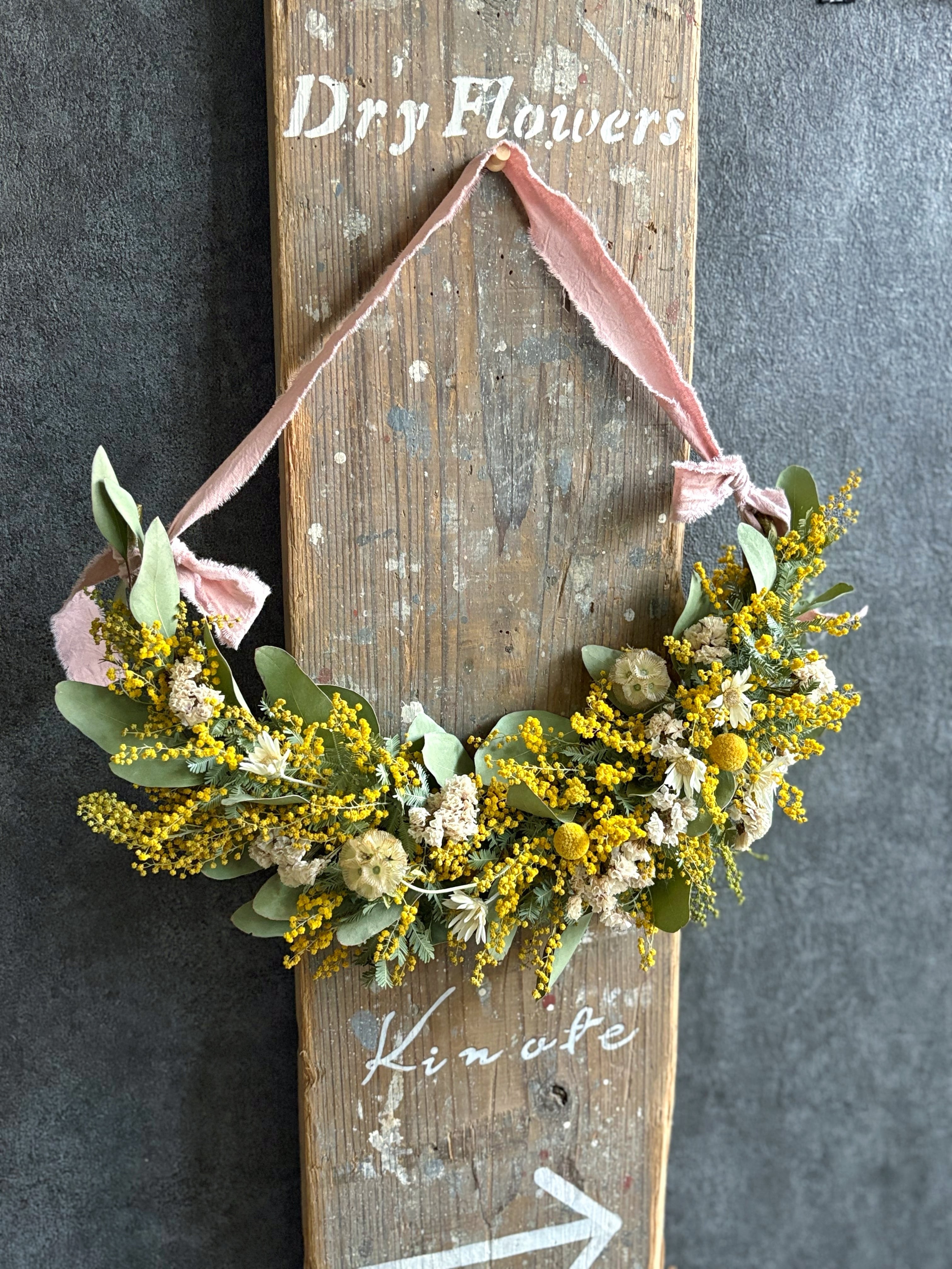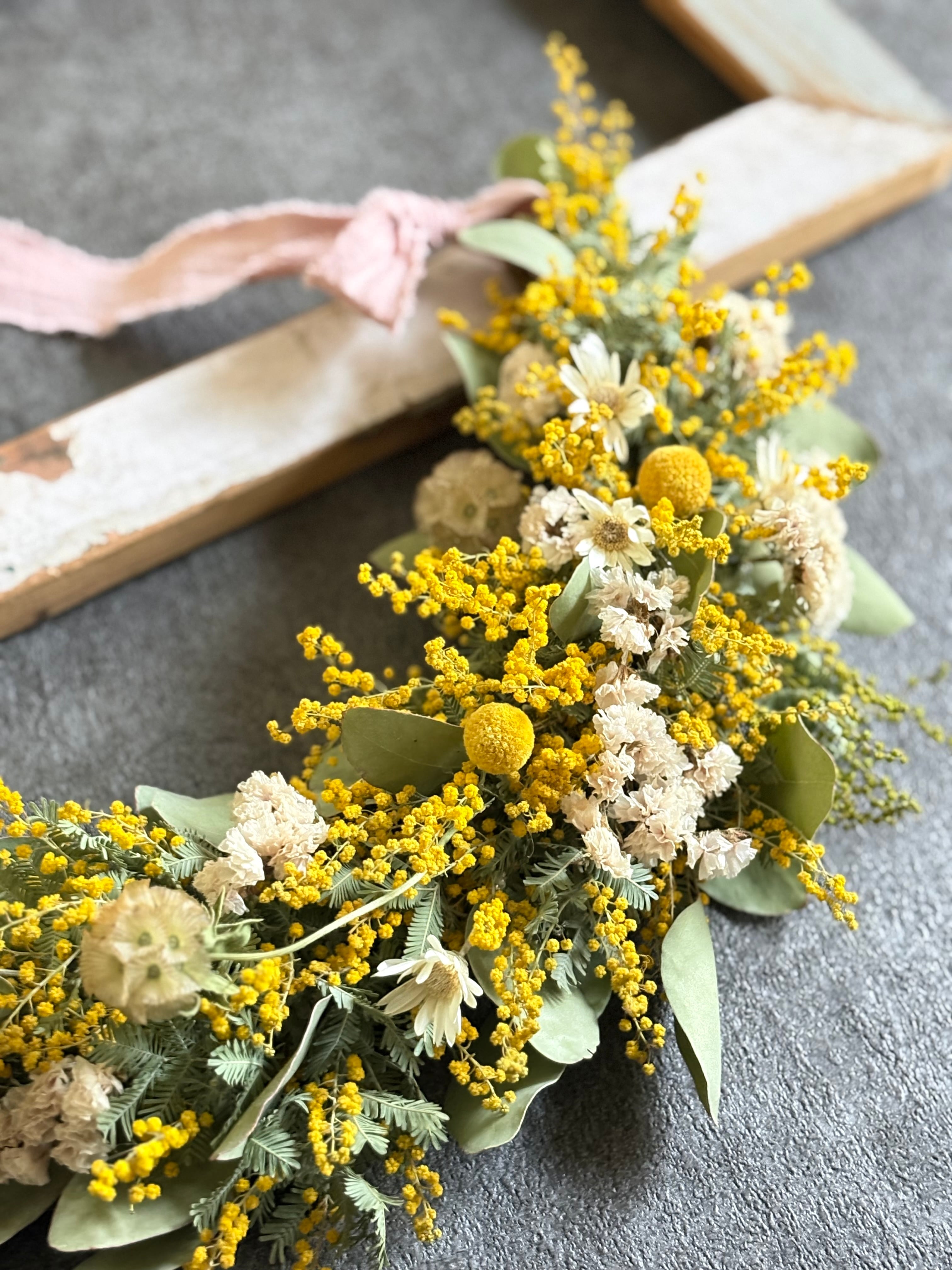 春を告げる花ミモザの春色ガーランドです。乾いたばかりの新鮮なミモザを使って制作いたします。