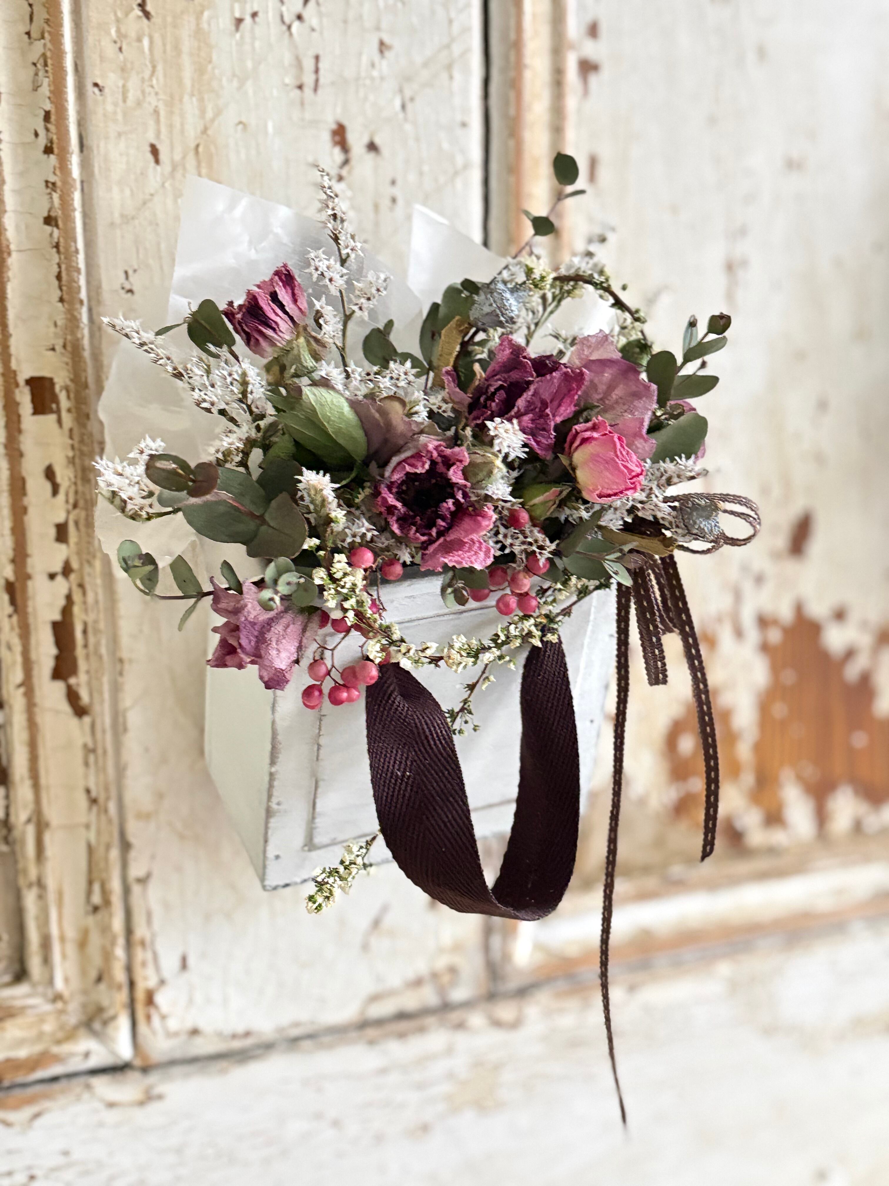 ウッドフルールバッグは非常にデリケートです。丁寧な梱包を心掛けておりますが、配送中に一部の花材が落ちる可能性がありますので、ご了承ください。