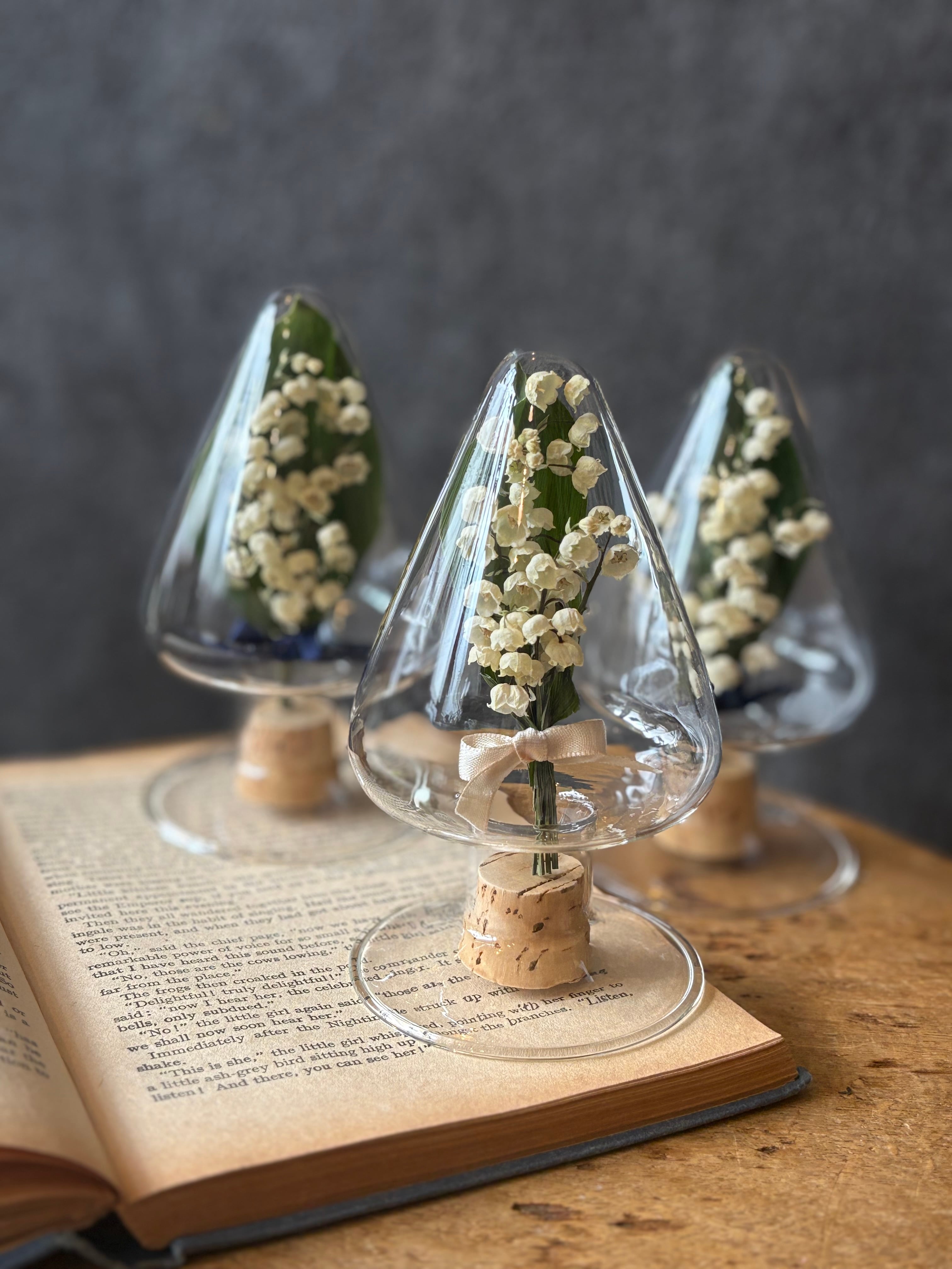 愛らしいすずらんのドライフラワーを三角ガラスのドームに閉じ込めた、特別なアートピースです