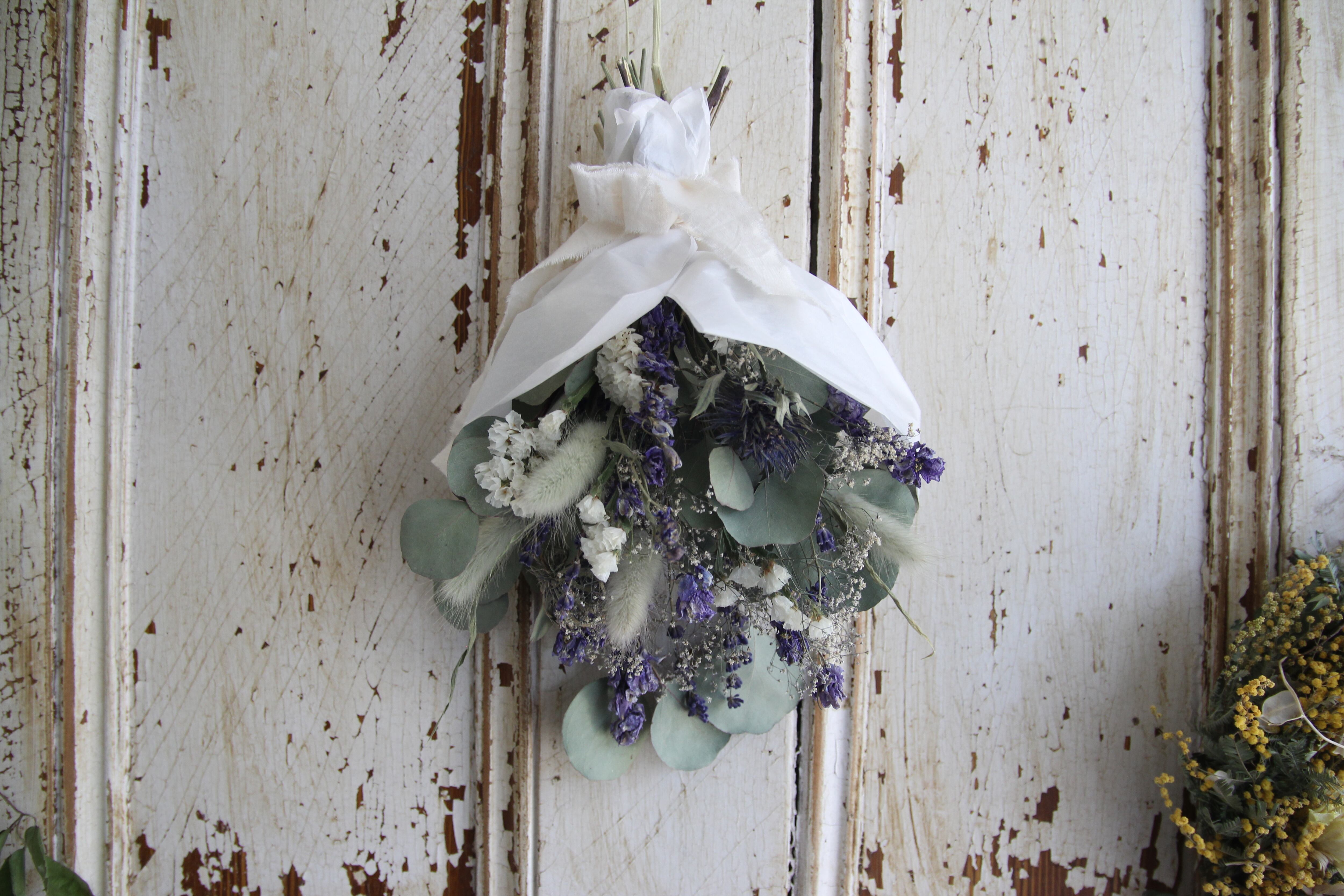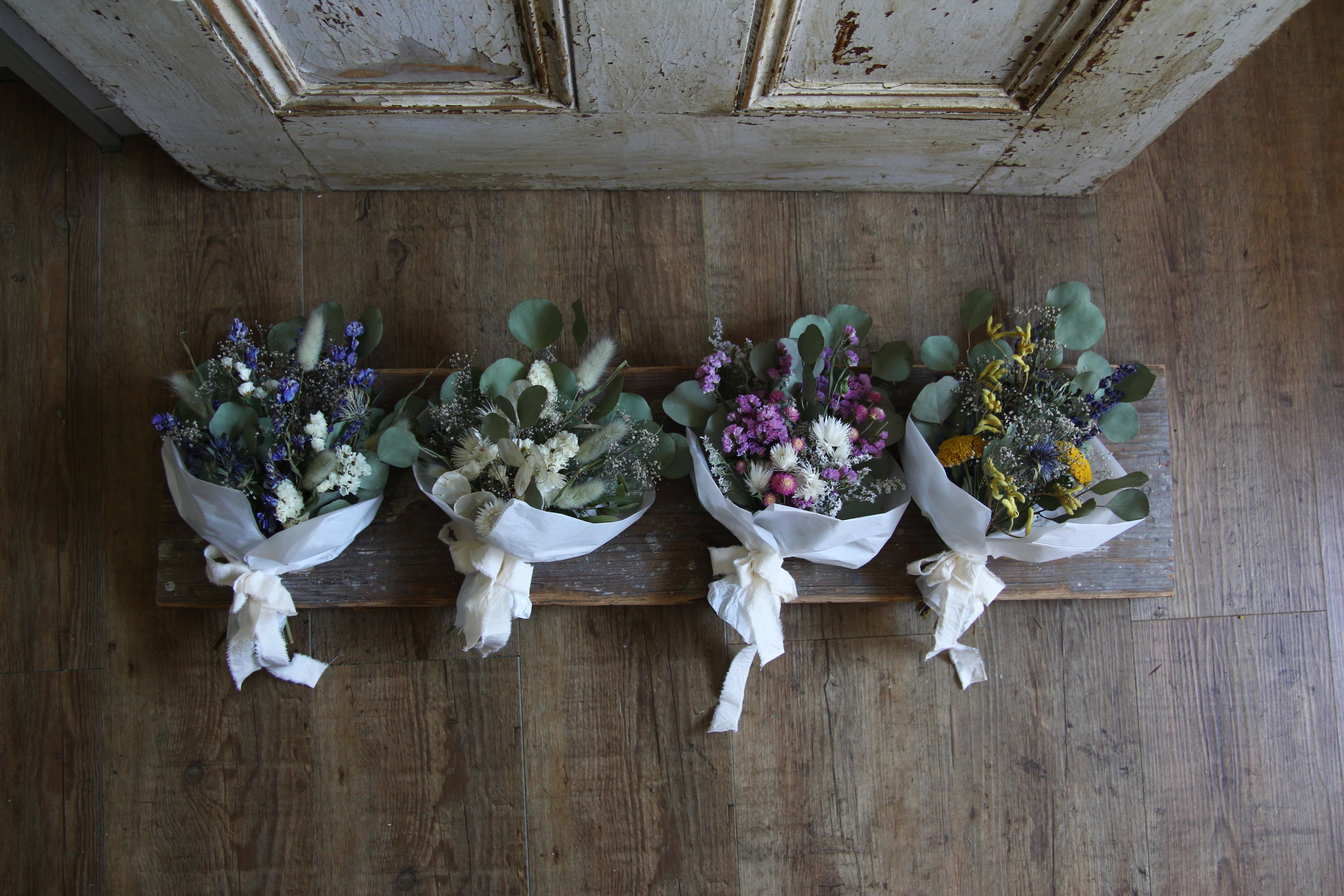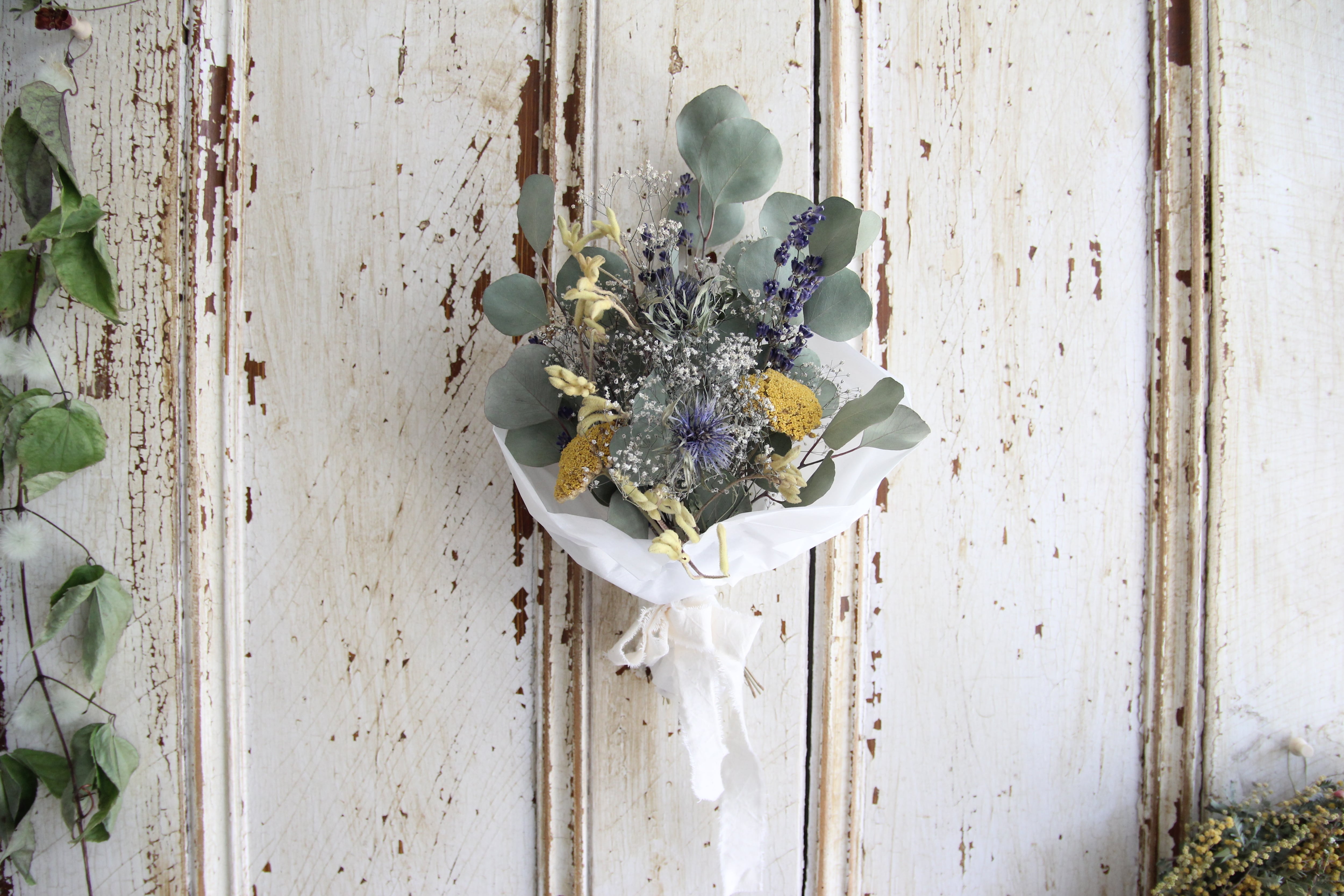 ピンク・白・ブルー・イエロー×ブルーのカラーバリエーションをご用意。ナチュラルドライフラワーの優しい色合いが気分を明るく彩ります。
